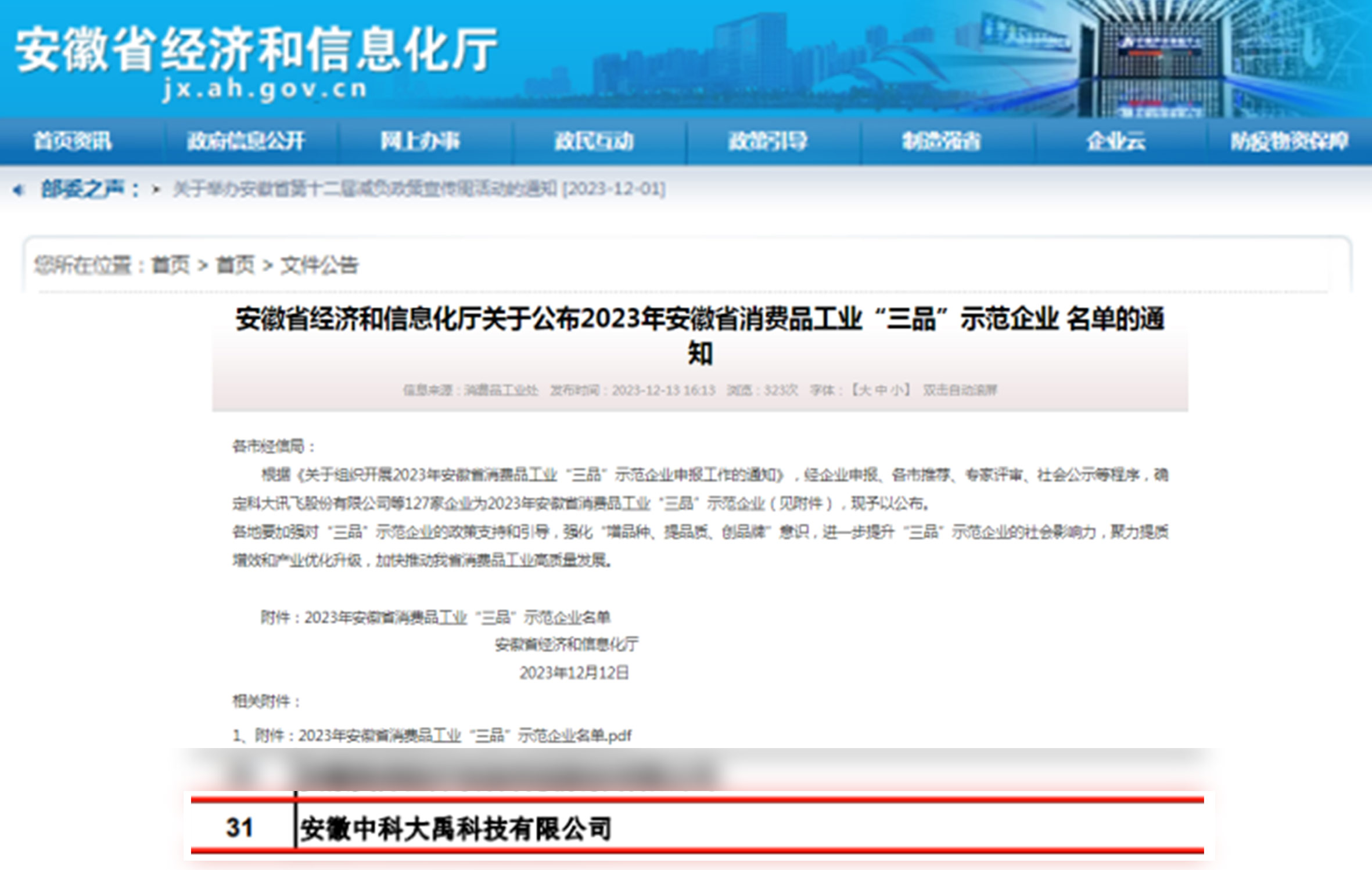 入選2023年安徽省消費品工業(yè)“三品”示范企業(yè)